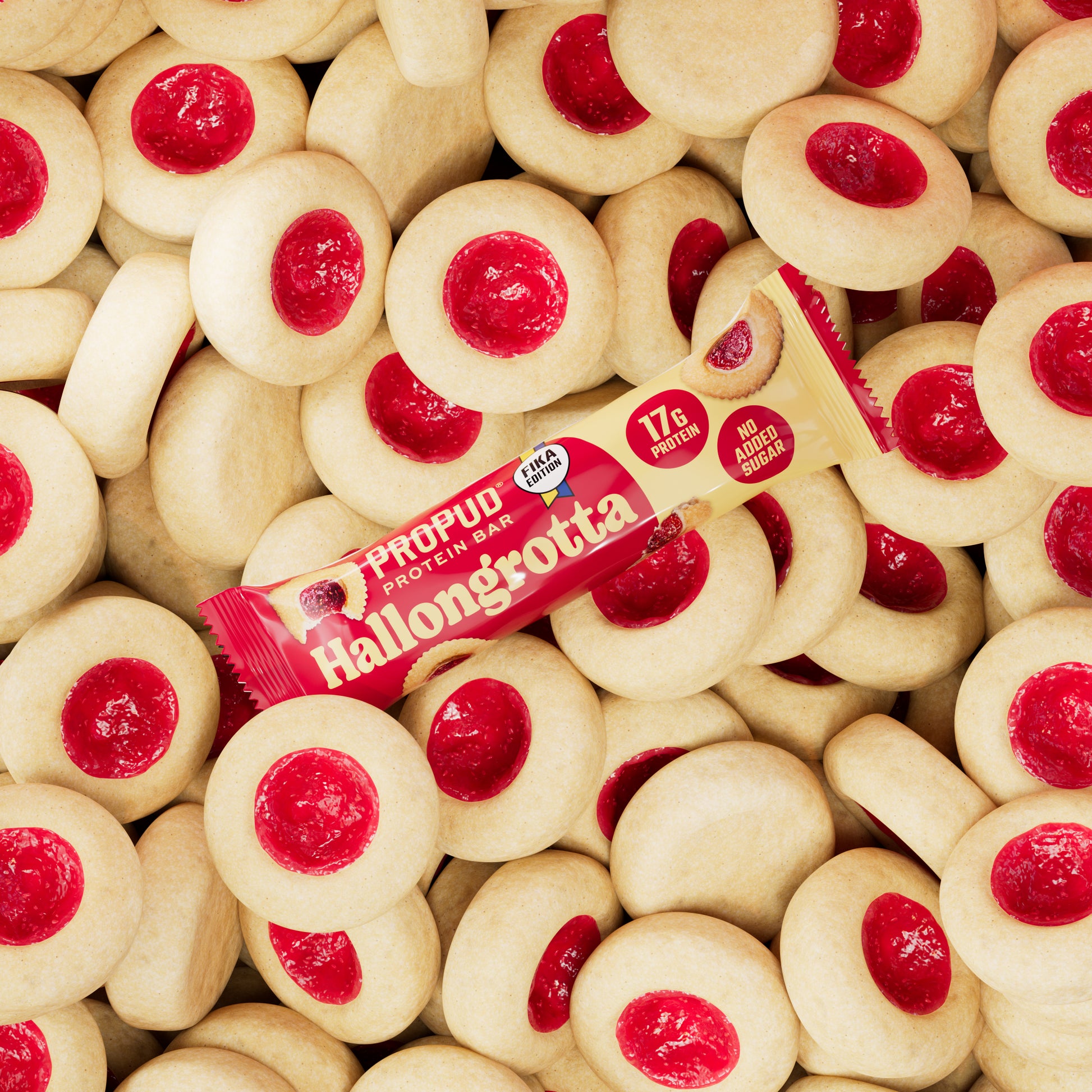 ProPud proteiinibatoon "hallongrotta" (magusainega) koostisained: PIIMAVALGUD, magusaine: maltitool, želatiin (veise), niiskusesäilitaja: glütserool, kakaovõi, polüdekstroosisiirup (täiteaine: polüdekstroos, vesi), lõssipulber, küpsisepurugraanulid (6,9%) (magusained: maltitool, isomalt, erütritool; maisijahu, kartulitärklis, VÕI, riisijahu, modifitseeritud tärklis, tapiokitärklis, sool, looduslik lõhna- ja maitseaine, kergitusaine: naatriumkarbonaadid), oligofruktoosisiirup (oligofruktoos, vesi), MANDELvalk, veevaba PIIMARASV, hape: sidrunhape, lõhna- ja maitseained (PIIM), sool, värvitoit: kontsentreeritud peedimahl, emulgaator: letsitiinid (SOJA), värvitoit: porgandimahla kontsentraat, magusained: aspartaam, atsesulfaam K. Sisaldab fenüülalaniini allikat.