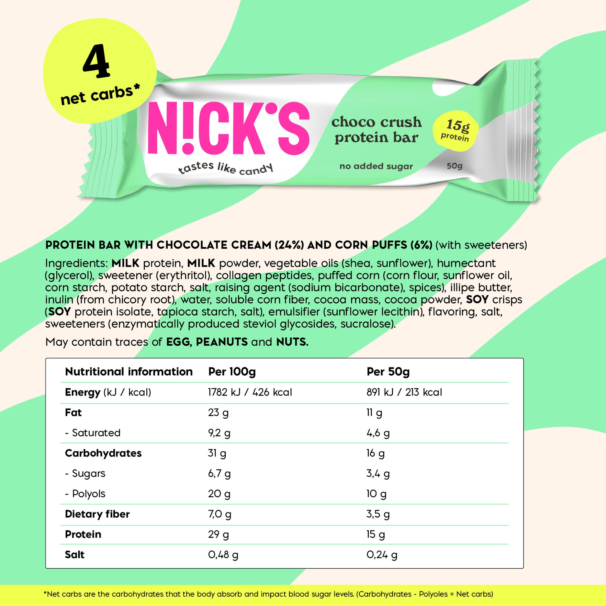 Protein bar "choco crush" 50g (with sweetener) Ingredients: milk protein, milk powder, vegetable oils (shea, sunflower), humectant (glycerol), sweetener (erythritol), collagen peptides, puffed corn (corn flour, sunflower, oil, corn flour, sunflower, starch). (sodium bicarbonate), spices), illipe butter, inulin (from chicory root), water, soluble corn fiber, cocoa mass, cocoa powder, soy crisps (soy protein isolate, tapioca starch, salt), emulsifier (sunflower lecithin), flavoring, salt, sweeteners (sucrosides, enzymatically produced steviol glycosides). May contain traces of eggs, peanuts, and nuts.